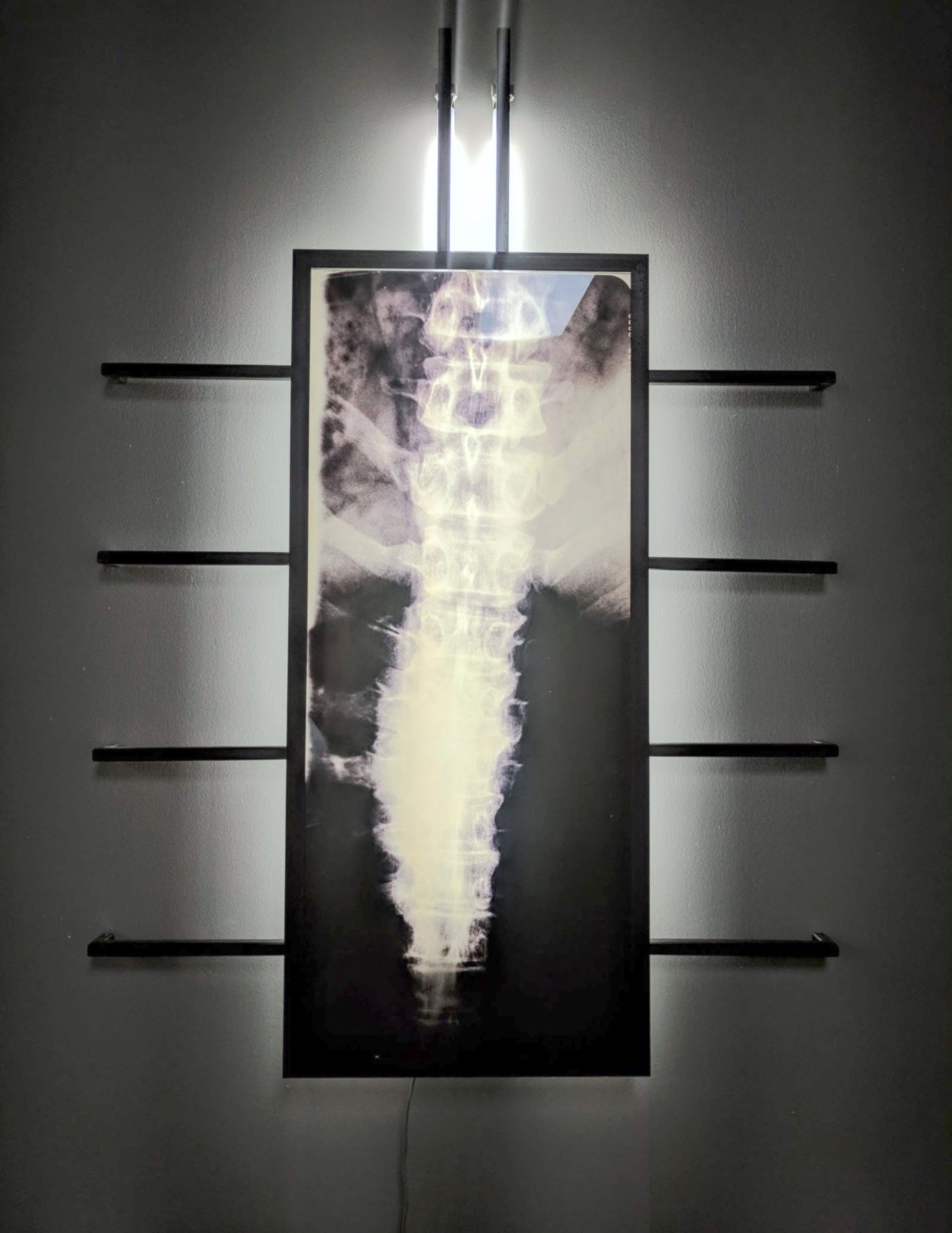 Both X-rays and whole-body scans from airports demonstrate human intimacy in a technical and growing virtual world. The fragmented unreadable text from the Old Testament prophecy combined with luminous images is a metaphor for intertwining human spirit and archetypes.(for more information about the artist: https://rainermariawehner.com)